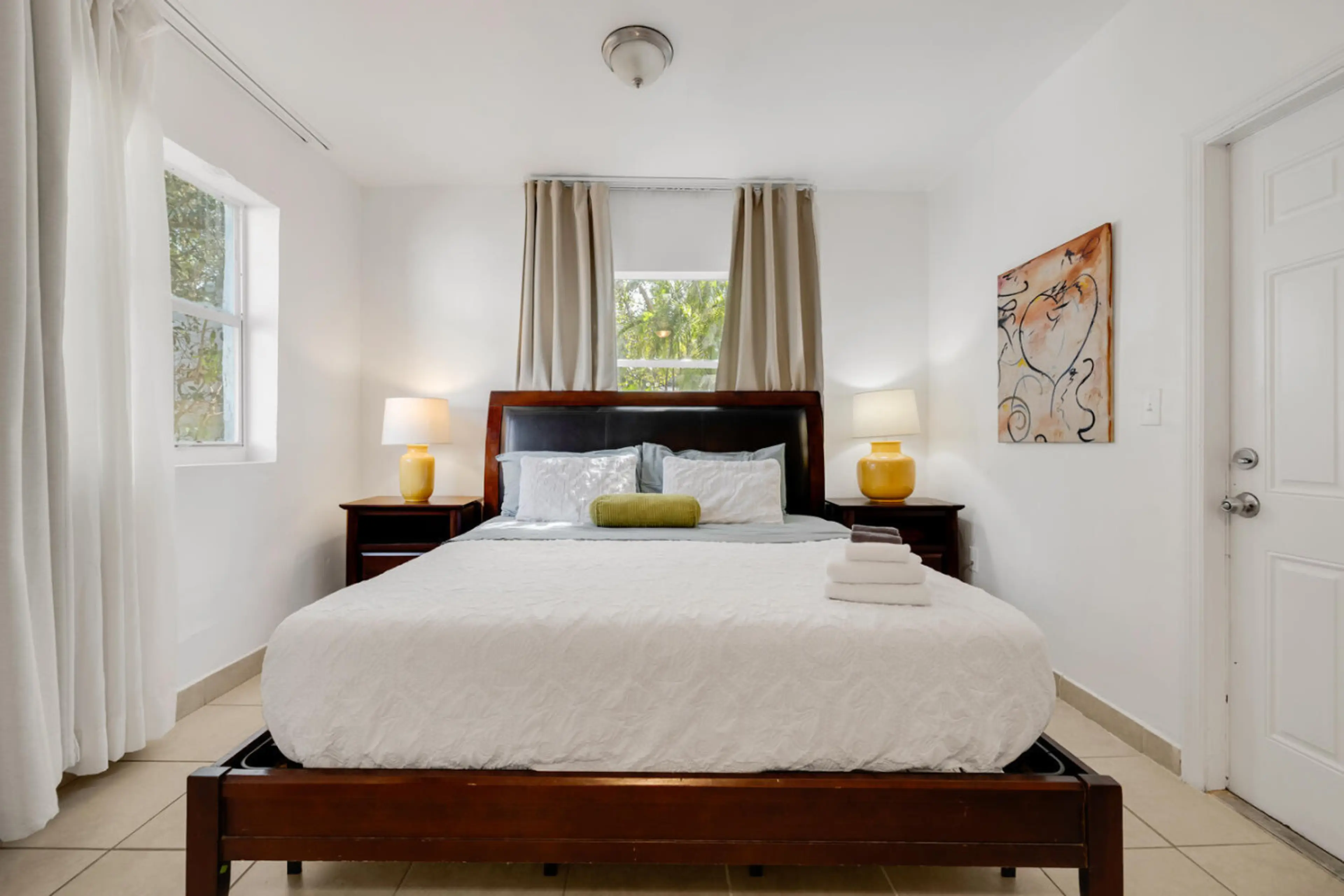 Negative: We had a SCARE on our first night. The front door does not have a double lock. The door knob lock does not work. The only lock working is the digital vault which in fact did not gave us security. While enjoying a card game in the living room, a man in hoodie opened the door and peek into the door, when he saw us, he backed away. We were all SHOCKED on how he was able to open the door while locked. He knew the code to the door!!! We called Olga, the host, her excused was that it was a maintenance guy. First, if you know you have guests in your rental property, you will inform them that a maintenance is coming. Second, you will tell the maintenance person to knock first because there are clients in the house. Third, a maintenance is not going to come at night. It was hard to believe her excuse. As a tourist in the area, we all felt unsafe. We asked to get a one day refund 'coz we don't feel safe at all. The neighborhood seemed sketchy, there were police roaming around the streets always (increase police presence means a lot of crime happening). The houses have bars over their windows and doors. All 10 of us did not sleep, the next day, we booked a hotel in the city. We didn't stay for our 2nd night even though the property mangers would not give us refund. They where willing to give us a refund if we leave the night the incident happened. Olga was a nice person but the incident of a male stranger able to unlock the door made us really scared. We were all female travelers by the way. The window on the other bedroom does not have a lock, we have to jam it with a broom stick. I wouldn't recommend the place for security purposes.
